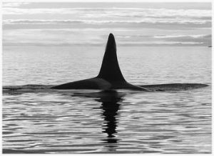 As I looked at the driftwood, I could faintly make out the form of a canoe. I had been studying the form of the Aboriginal canoe for another project, yet this former mental image was not at all the way I was seeing a canoe in this piece of driftwood. There was a canoe forming in the wood, much more dominant than the forming of the two originally conceived paddles. I began carving, bringing out the unusual shape that this canoe was taking. I carved tentatively. During this phase of the carving process I became aware of a dorsal fin of an orca whale protruding from beneath the form of the canoe and from within the main bulk of the driftwood root ball.