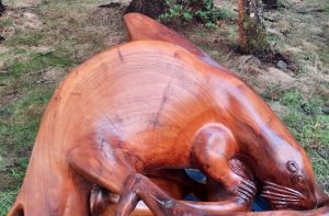 There seemed to be enough wood to carve the front paw. I carved, then proceeded to the otter’s head features. The otter was destined to share its head with the whale. I was amazed at that particular transition, that of otter into whale, of whale into otter. Even though I was the sculptor, I was amazed. I continued. I carved other figures. All the while, with visual cues, I was carving other figures within the root ball, listening, carving then listening again. Carefully, in touch with my level of comfort, I listened, I carved. Throughout this process I was becoming aware of a feeling that I was not designing this piece.